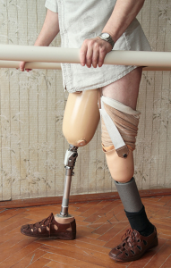 An injury-related disability is one that is caused from an accident, injury, or trauma. For example, motor vehicle accidents can result in a spinal cord injury and cause paraplegia (loss of function of the lower body or legs) or quadriplegia (loss of the ability to use both the upper and lower part of the body or limbs). A person may also lose a limb due to an accident or as a result of a disease process. For example, due to impaired circulation, a person who has diabetes may have a foot or leg amputated (removal of a limb). Diseases that are progressive (become worse) can also result in a person having a physical disability. For example, muscular dystrophy (MD) is a progressive muscular disease that is inherited and which may become obvious at birth or later in life. People with MD have a gradual wasting away of their muscles and have difficulty with physically moving due to muscle twitching, stiffness, or atrophy (wasting away of muscle).